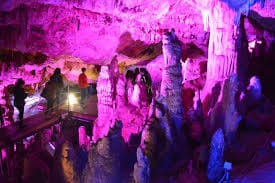With a surface area of 3,500 square meters, the “Sfentoni” Cave is one of Greece’s most spectacular caves. It is a large cave with a north-south orientation, a maximum length of 145 meters in a straight line, a total area of about 3000 square meters, and a variety of chambers with fanciful names (The Harmonies, the Sanctum of the Fairy, the Chapel, the Palace, the Parthenon, the Panorama, the Metropolis, the Lost Child, the Fossilized Waves) succeeding each other. The cave features rich decoration with stalactites and stalagmites, as well as several fossilized waves (stony water basins) near its end.