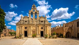In the footsteps of history and craftsmanship.A trip to the past in the heart of the island: Heading east, passing Rethymnon, at the foot of the Ida mountains lies the Arkadiou Monastery, the holiest place in Crete, lonely in the valley! The heroic rebellion against the Ottoman Empire began here in 1866. Thanks to the bravery and sacrifice of the Cretans, Arkadi was recognized worldwide as a symbol of freedom!We continue northeast passing Psiloritis, the highest mountain of Crete. Welcome to Margarites, a village straight out of a fairy tale. The whole village makes pottery! Handicraft is an ancient tradition here. Stroll through the colorfully decorated alleys and enjoy typical Cretan cuisine in the village square.High on the hill of the Mylopotamos valley you can see the Melidoni stalactite cave, which is about 200 million years old. In addition to the impressive stalactites and stalagmites, you can admire strange wall paintings from the Hellenistic era to the 20th century. In ancient times, the Greek gods were worshiped here, especially Hermes!